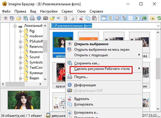Напомню лишь, что если вы желаете с помощью данной программы сделать определённую картинку рисунком рабочего стола, то в этом случае, изображение открывать не следует. Просто подведите курсор к нужному фото и правой клавишей кликните по картинке. Затем, в контекстном меню выбираем «Сделать рисунком рабочего».