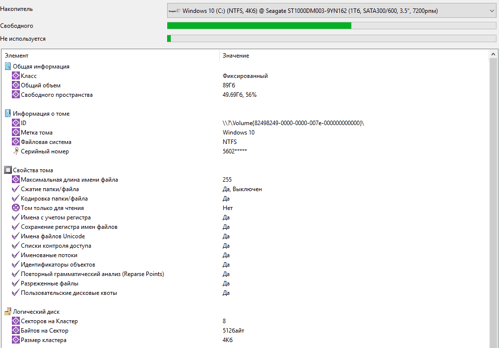 Как видите, логический диск у меня один, и одна зелёная полоса, которая занимает примерно половину от возможного места. Это очень хорошо. Для системных дисков желательно, чтобы свободного места было примерно 20% от занятого.
