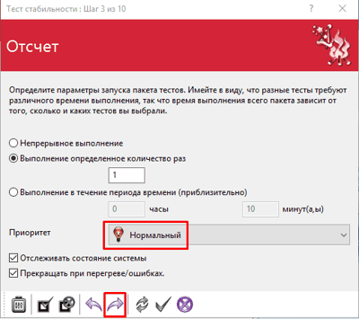 В «Отчете» количество раз я поставил 1, приоритет «Нормальный» (если поставить несколько цифр, тест может затянуться). Также, тест затягивается из-за того, что я поставил приоритет «Нормальный» а не «Низкий».
