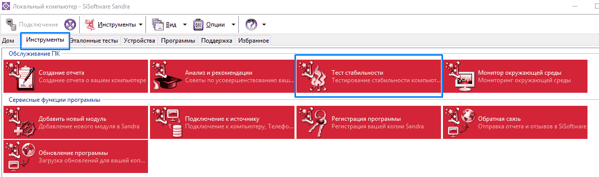 Первым делом, я советую войти во вкладку «инструменты» и выбрать такую функцию программы, как «Тест стабильности». Это очень важная функция. Если у вас есть какая-то проблема с системой или определенным узлом компьютера, функция её определит. Скажет, какой элемент компьютера барахлит (это очень удобно, подобную проблему иногда определить очень сложно).